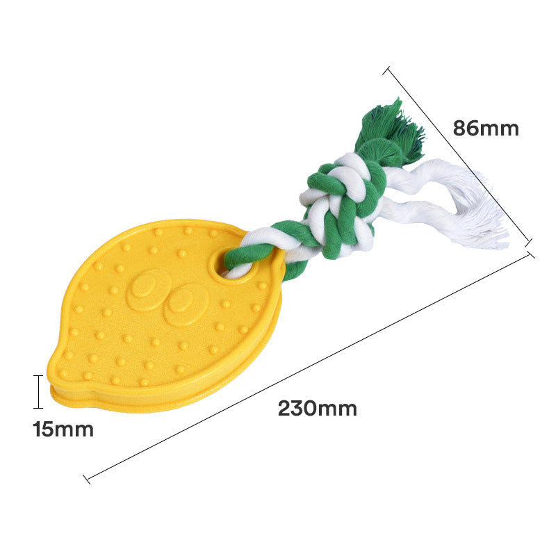 Bright yellow lemon-shaped chew toy designed for fun, tooth cleaning, and stress relief all in one. The ridged massage design helps clean teeth while the rope section fosters interactive bonding time with your pup.